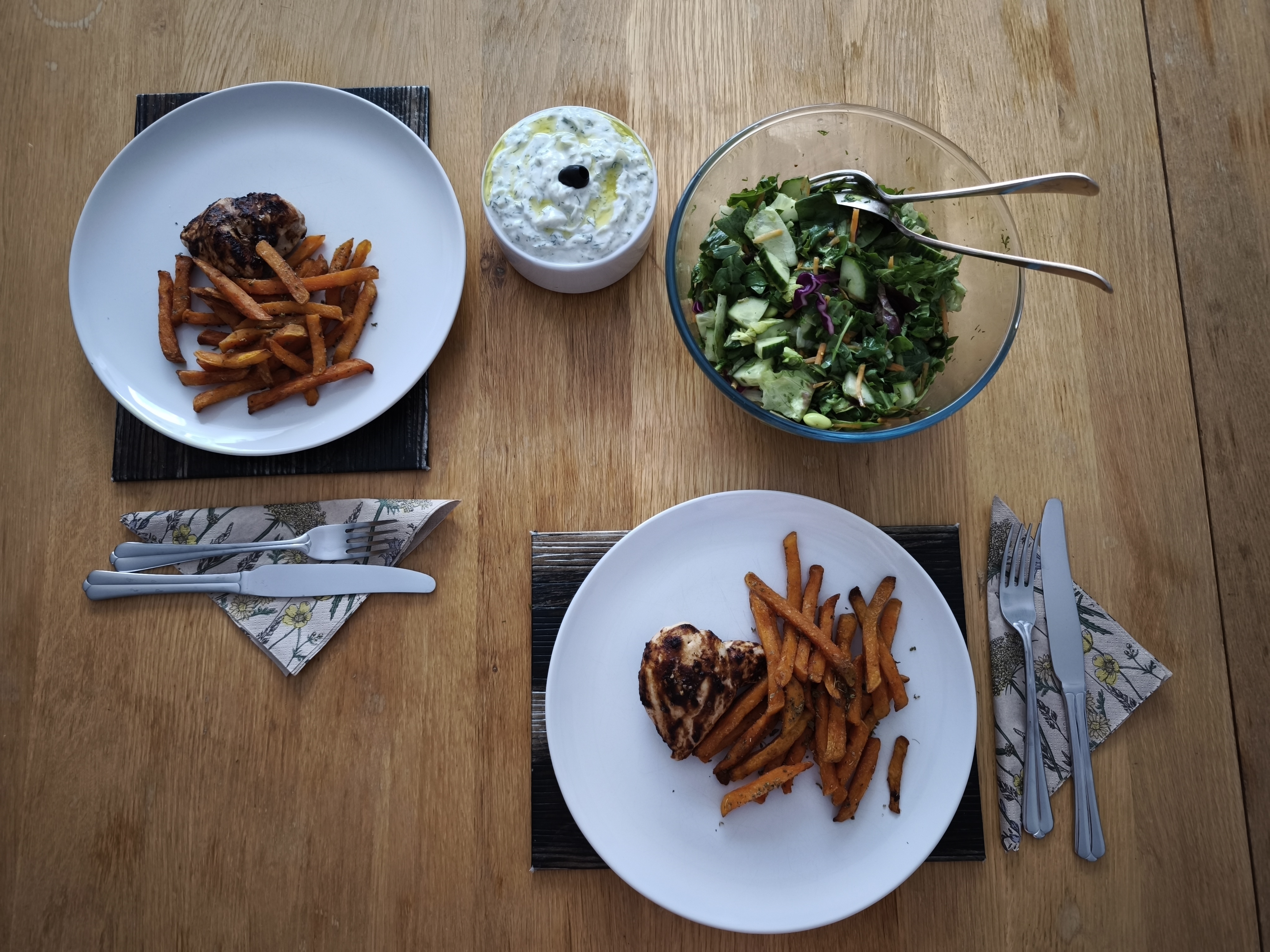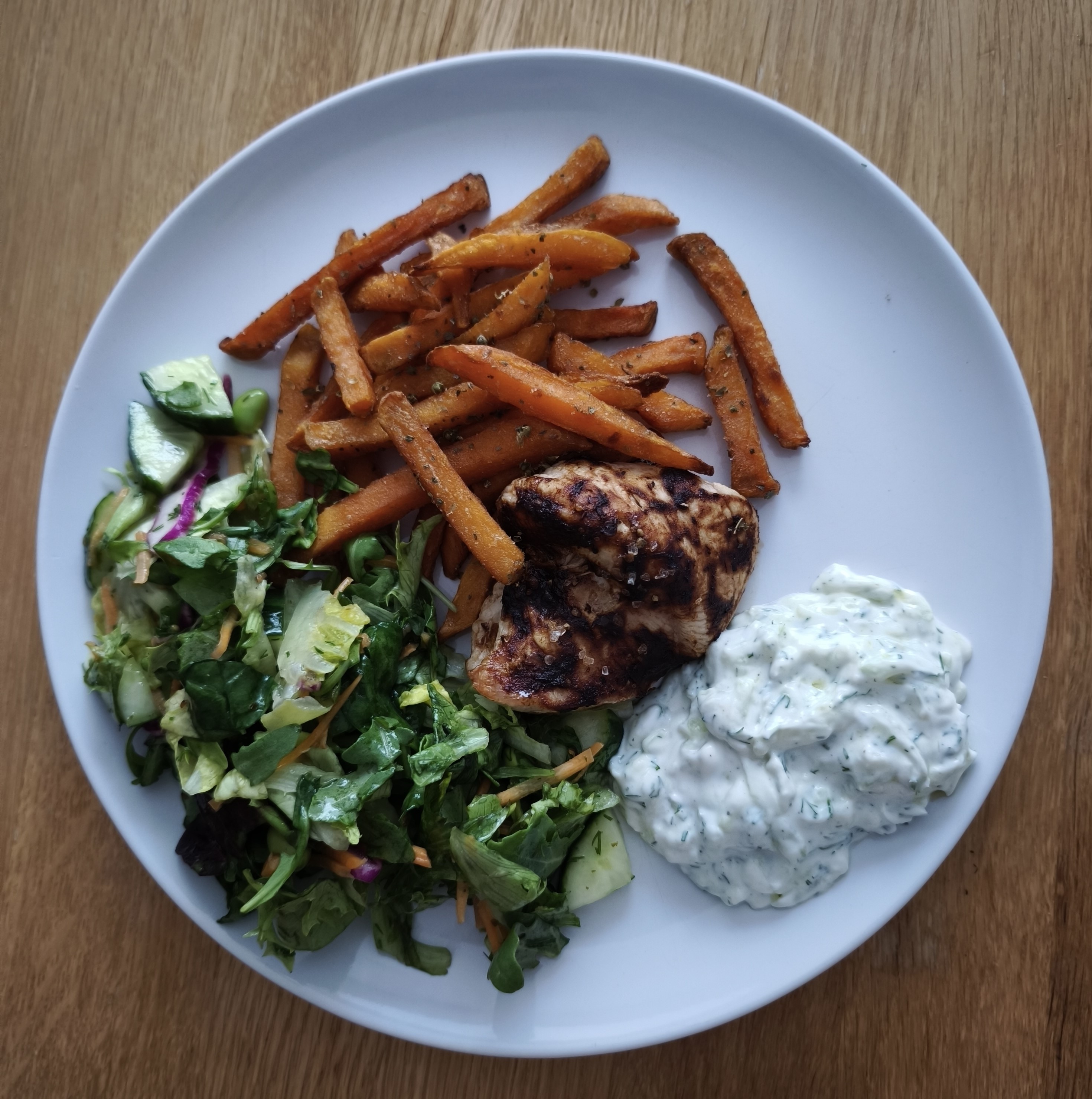 - Serve: Once the sweet potato fries are golden and crispy, remove them from the oven and season generously with salt, pepper, and dried oregano. Plate the chicken, sweet potato chips, and salad, and serve with a generous dollop of homemade tzatziki.