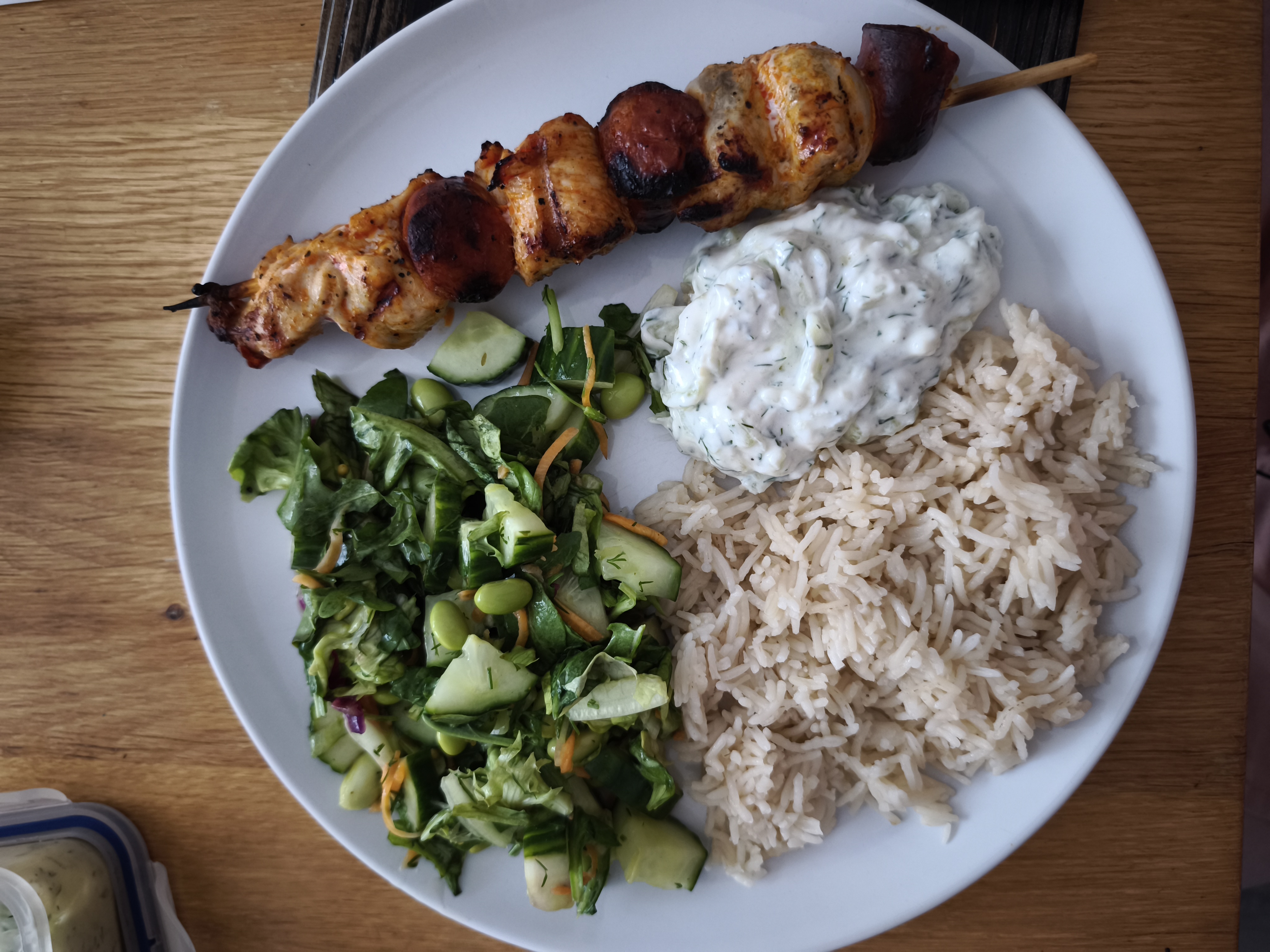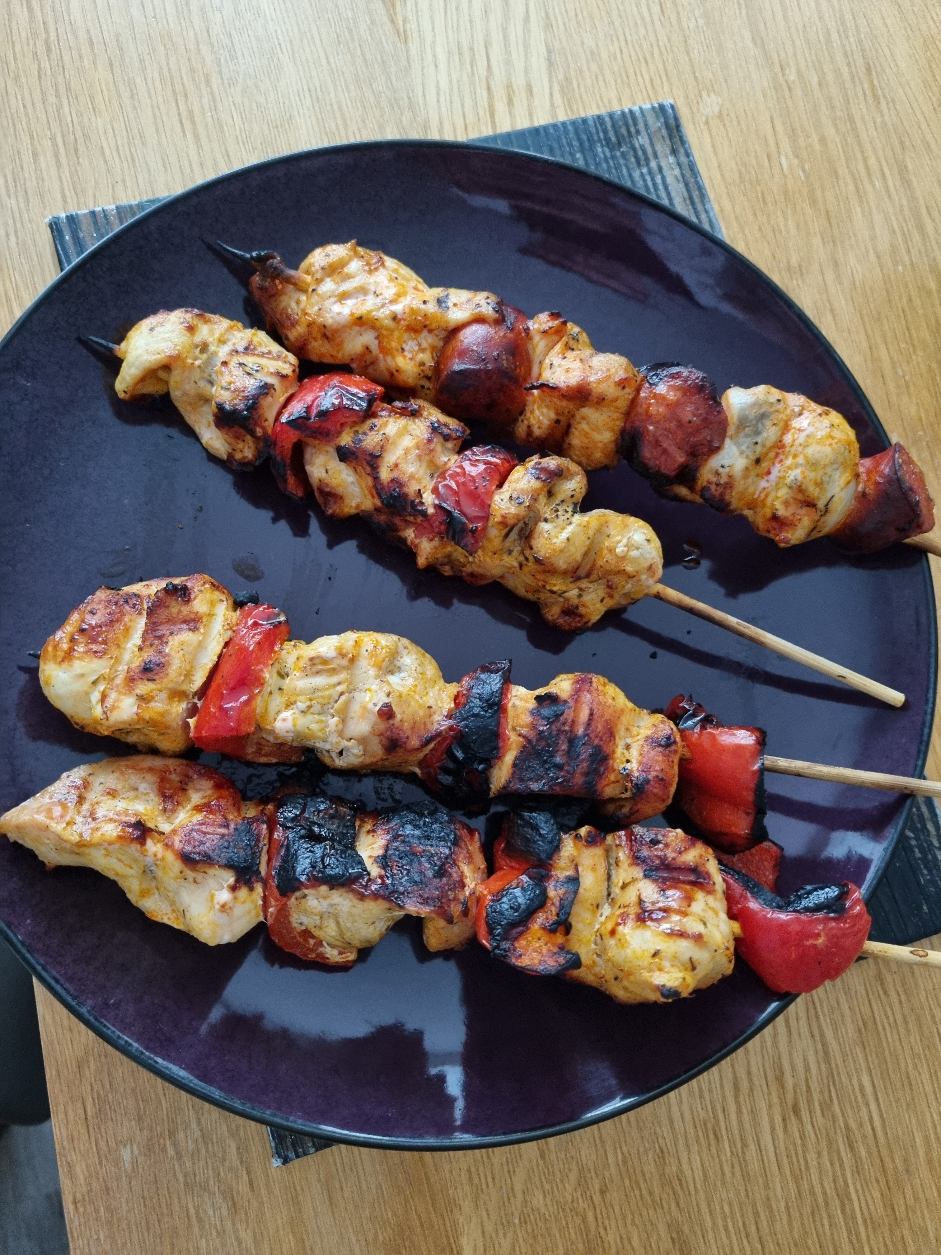 This was my first time grilling on a gas barbecue – there’s definitely room for improvement, but the pre-marinated skewers from our local butchers were delicious, as always! I recommend to try chicken & chorizo skewers (easy to make yourself if your local butcher doesn’t do it), but keep in mind – they are much better fresh than as leftovers the next day.