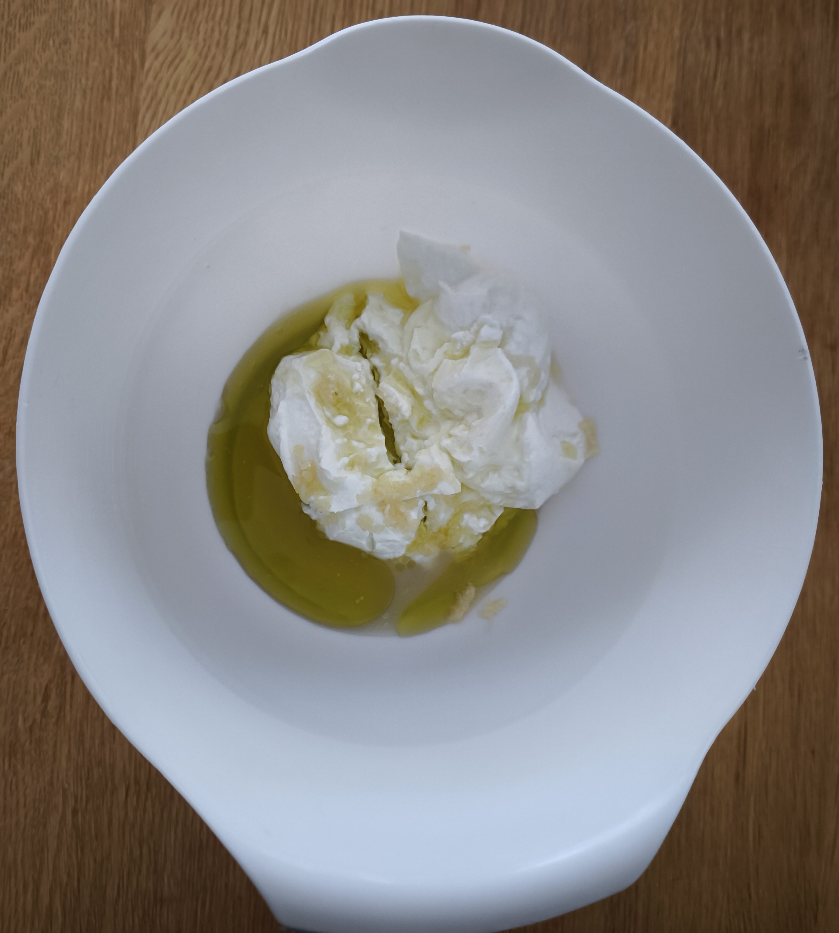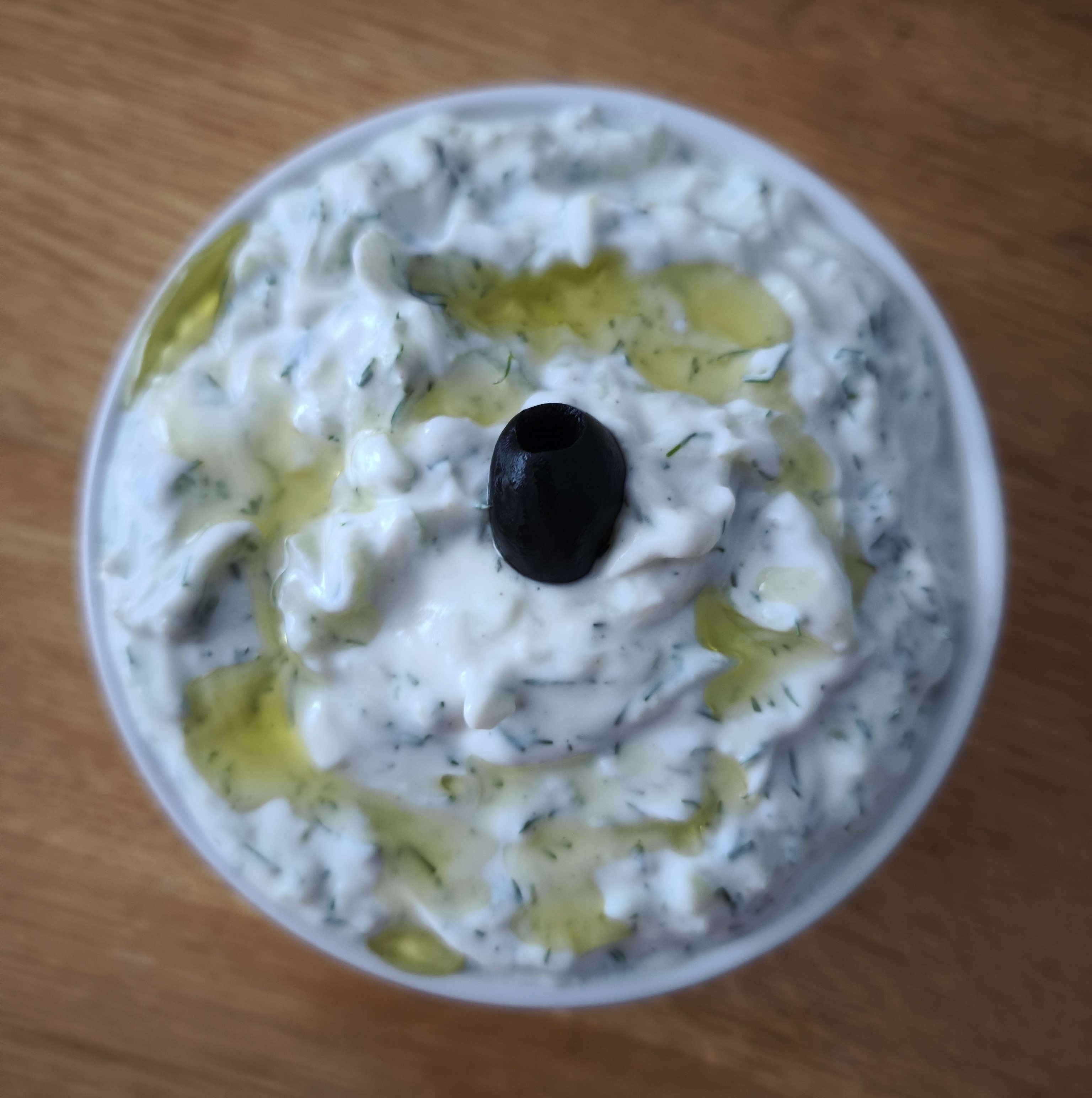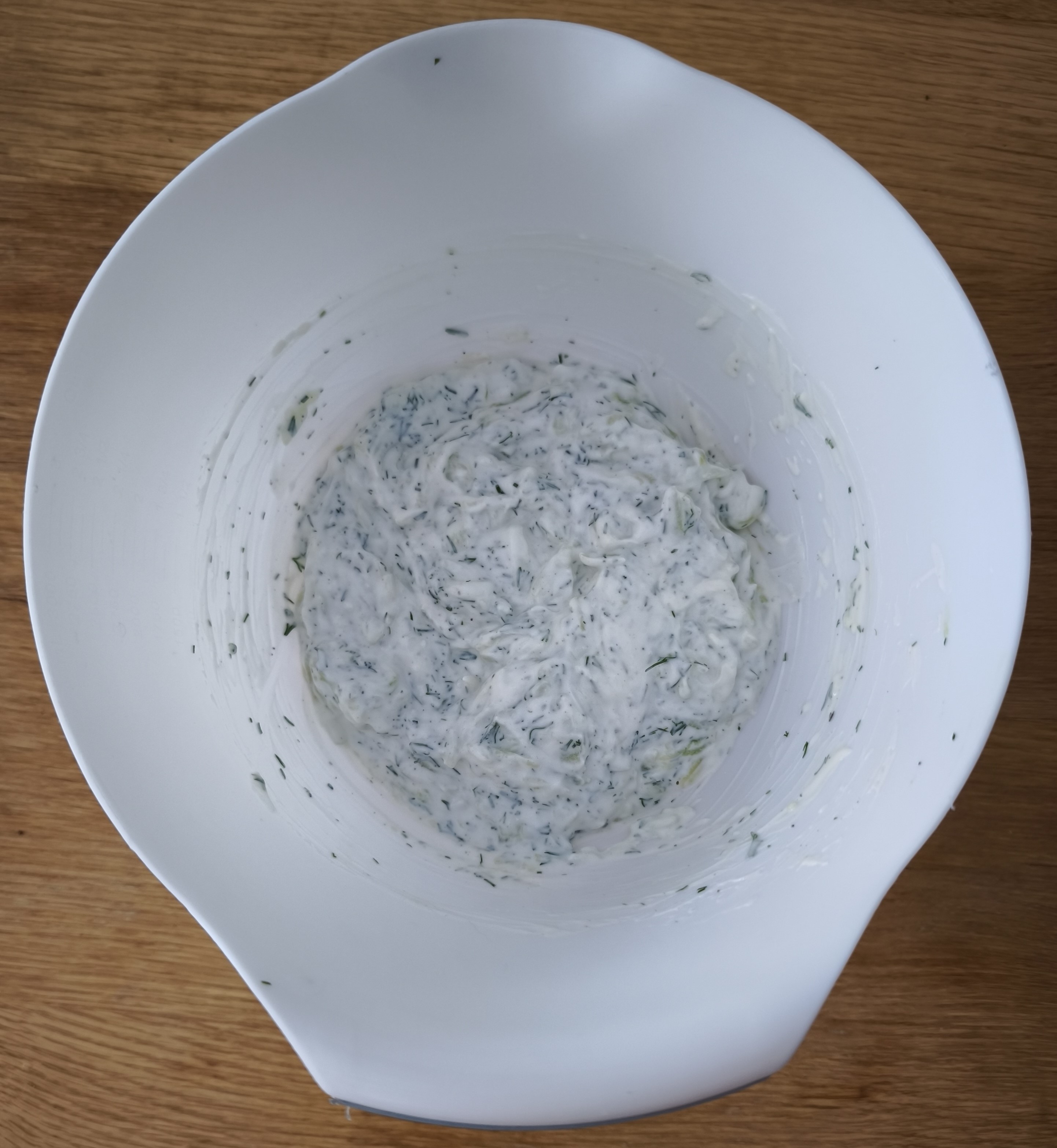 - Prepare Tzatziki Flavors: Wash, dry, and chop the fresh dill. In a separate bowl, combine the strained yogurt, minced garlic, remaining white wine vinegar, and olive oil. Mix well.